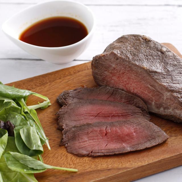 北海道産牛のモモ肉を使用し、食塩と香辛料のみを加えローストビーフを作りました。肉の中心部まで通熱しているのでスライスしてそのままお召し上がりいただけます。きめ細やかで柔らかいお肉は、脂肪分が少なく、牛肉独自のクセも少なく、低脂肪、低カロリーのお肉です。あっさりとしているのに噛めば噛むほどにお肉の旨味を存分に楽しめます。
