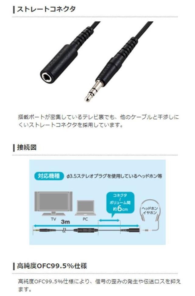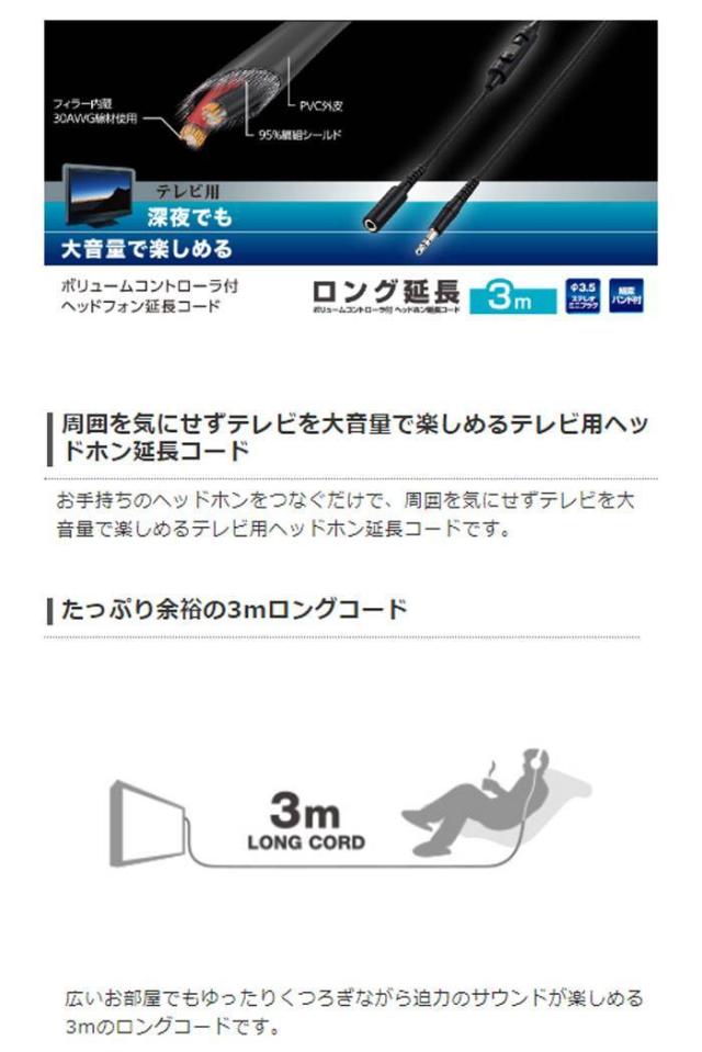 お手持ちのヘッドホンをつなぐだけで、周囲を気にせずテレビを大音量で楽しめるテレビ用ヘッドホン延長コードです。広いお部屋でもゆったりくつろぎながら迫力のサウンドが楽しめる3mのロングコードです。テレビリモコンを使用することなく音量調節ができる手元ボリュームコントローラーがついています。不使用時にコードを整理できる結束バンドがついています。断線に強く、8万回の屈曲試験※に合格した高耐久モデルです。※当社基準。配線内部の密度を高め、屈曲に対する耐久力を強化する95%編組シールドを使用しています。内部線材どうしの摩擦による劣化を防ぐフィラーを内蔵しています。太く頑丈な30AWG線材を使用しています。高純度OFC99.5%仕様により、信号の歪みの発生や伝送ロスを抑えます。コネクタには、通常よりブッシュを長くすることでプラグ部分にかかる負担を軽減するロングブッシュ構造を採用しています。搭載ポートが密集しているテレビ裏でも、他のケーブルと干渉しにくいストレートコネクタを採用しています。