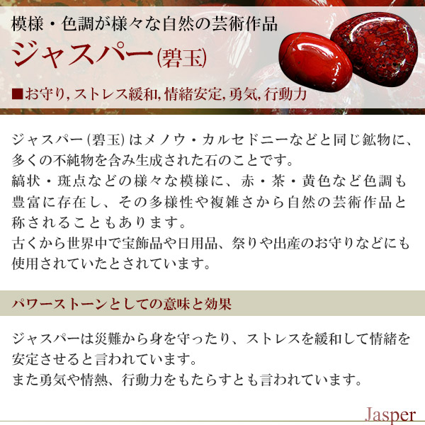 ジャスパー(碧玉)はメノウ・カルセドニーなどと同じ鉱物に、多くの不純物を含み生成された石のことです。縞状・斑点などの様々な模様に、赤・茶・黄色など色調も豊富に存在し、その多様性や複雑さから自然の芸術作品と称されることもあります。