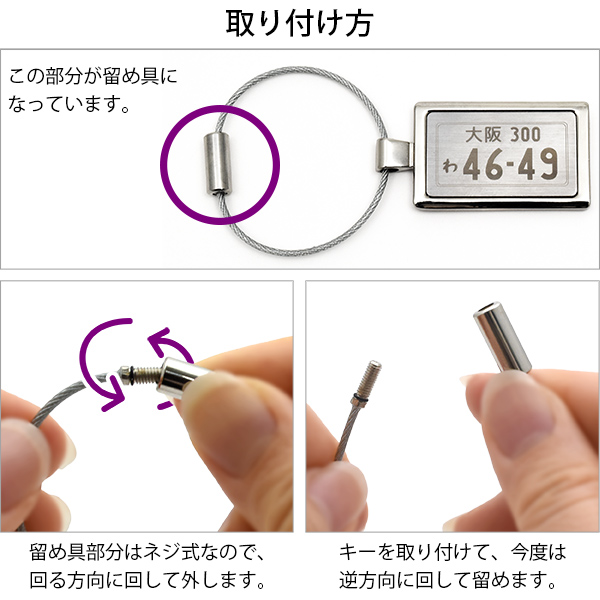 留め具はネジ式。くるくる回すだけで外れるので、キーの取り付けも簡単です!