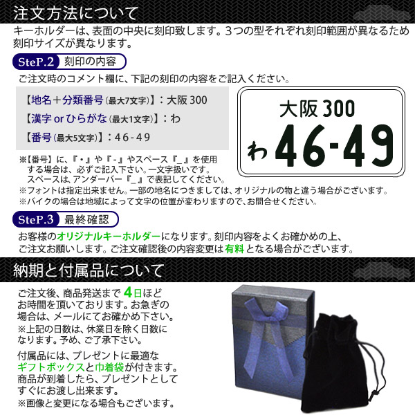 キーチェーンに、愛車のナンバーを無料で刻印致します!