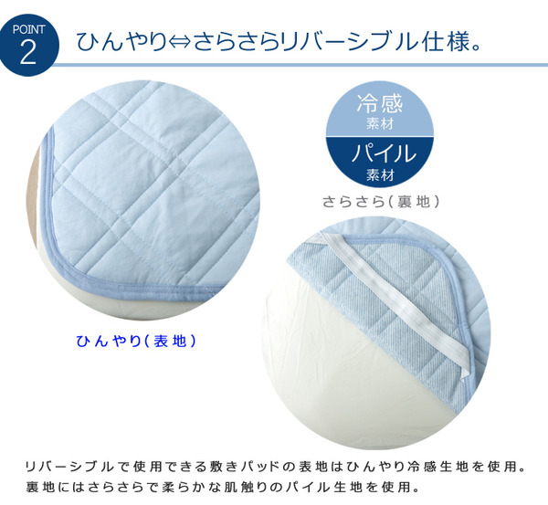 接触冷感・吸水速乾・消臭機能が特徴の商品です。こちらの商品は、両面使えるリバーシブル素材です。表地にはQ-MAX0.4以上の冷感素材を使用。裏面には柔らかな肌触りが特徴のソフト吸水速乾パイルを使用しています。エアコンが苦手な方でも快適に。節電、節約にもつながる商品です。ズレにくいよう四隅にはゴムバンド付きです。洗濯機で丸洗いが可能なので、いつでも清潔にご使用頂けます。
