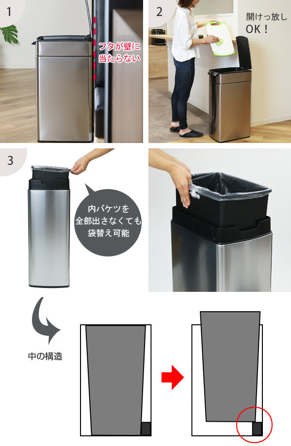 1、背面を壁にぴったりくっつけて設置しても、フタが壁に当たらずスムーズに開閉できます。