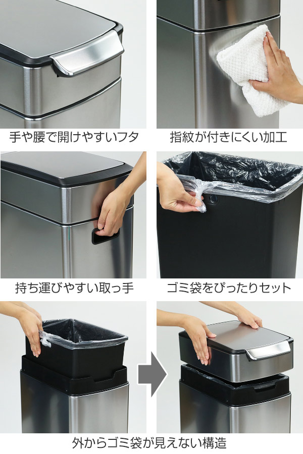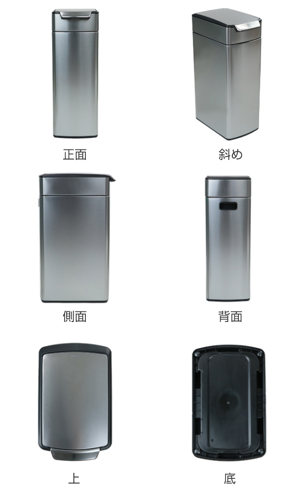キッチンはもちろん、オフィスや人目の多い場所にもすっきりとなじむ、高級感のある外観です。テーブル横や限られたスペースにも置きやすいスリムサイズ。質のよいステンレス製で、清潔感とスタイリッシュさ、抜群の耐久性を兼ね備えたダストボックスです。