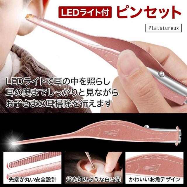 LEDライトで耳の穴を照らし、耳の奥までしっかりと見ながら耳垢を除去できます。細かい作業がしやすいピンセットタイプで、ムダな刺激を与えずにお子さまの耳掃除が行えます。かわいいお魚デザイン。
