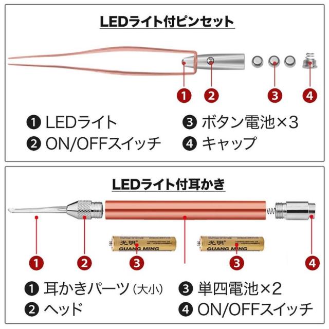 LEDライトの明るい光で、暗い耳穴を照らしながら耳掃除ができるピンセット&耳かきセット。奥まではっきりと見えるので、耳垢を目視しながら的確に耳掃除が可能です。夜間の耳掃除にもおすすめです。