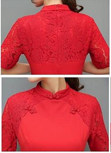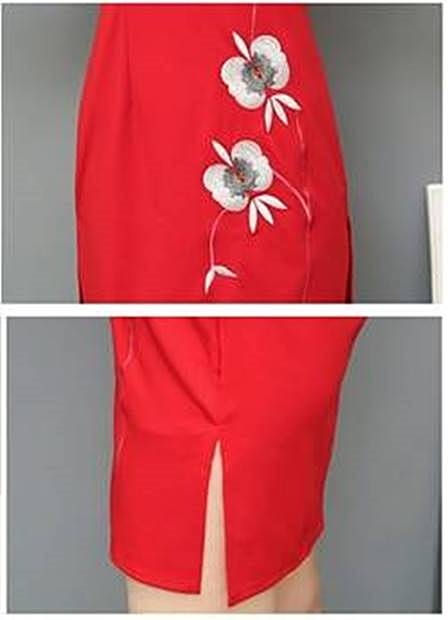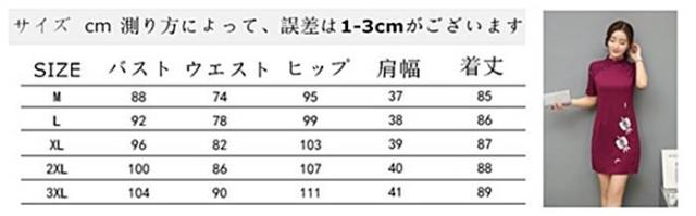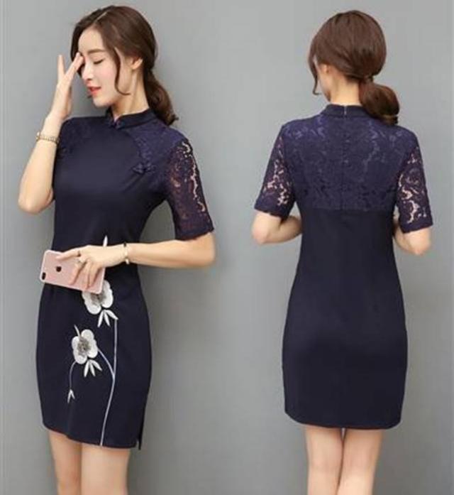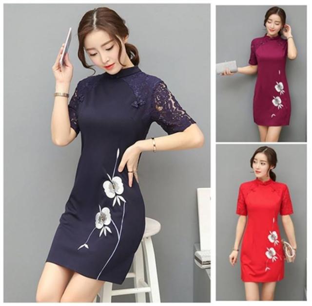 腰下に花柄刺繍があり、首から肩と腕にかけて、透かしレースになっている、おしゃれなチャイナ風ワンピースです。