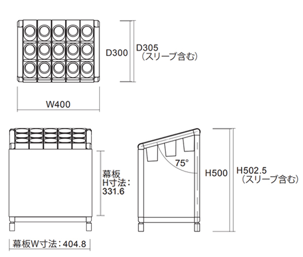 | 材質 | 本体:ステンレスクラッド管 幕板:亜鉛メッキ鋼板アクリル塗装 スリーブ:ABS樹脂 水受皿:再生ABS樹脂 |
