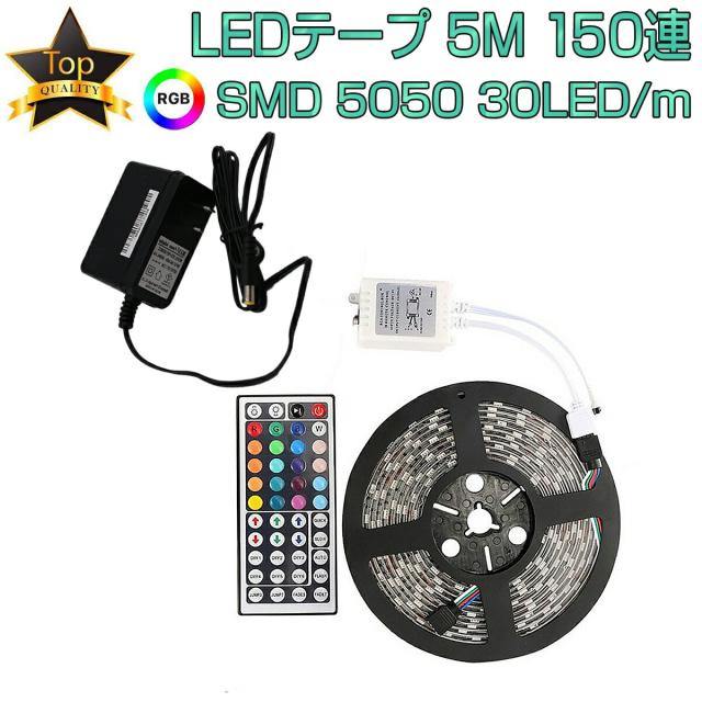 LEDテープ 5m 部屋 SMD5050 RGB 150連 20色 調光 リモコン 防水 高輝度 テープLED カット可能 1mにつき30LED 12V 1ヶ月保証