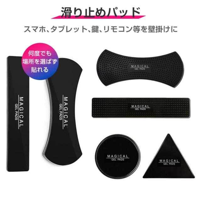 ・マジカルジェルパッド採用で何度でも簡単に貼り直せ、長方形と円形と三角形の3種類、計6枚の滑り止めパッドで幅広く半永久的に使えます。