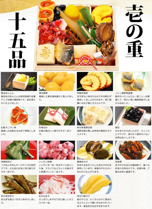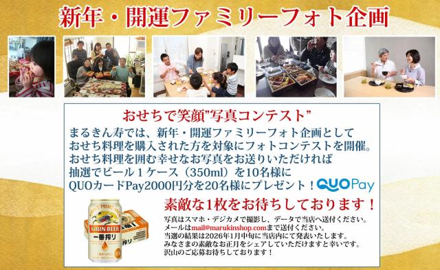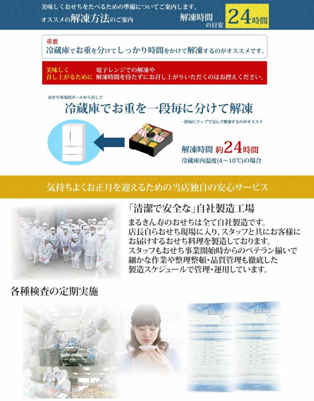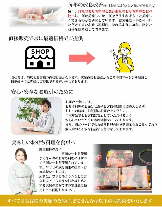 注意事項 当店のおせち料理は細心の注意を払って製造をしておりますが、ご高齢の方やお子様におかれましては、お餅系やえびくるみなどの一部商品はお召し上がりいただく際に、少量ずつ食べることでより安全にお召し上がりいただけます。