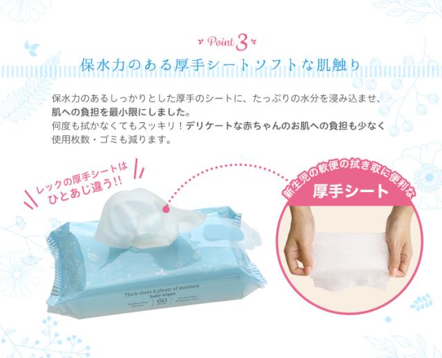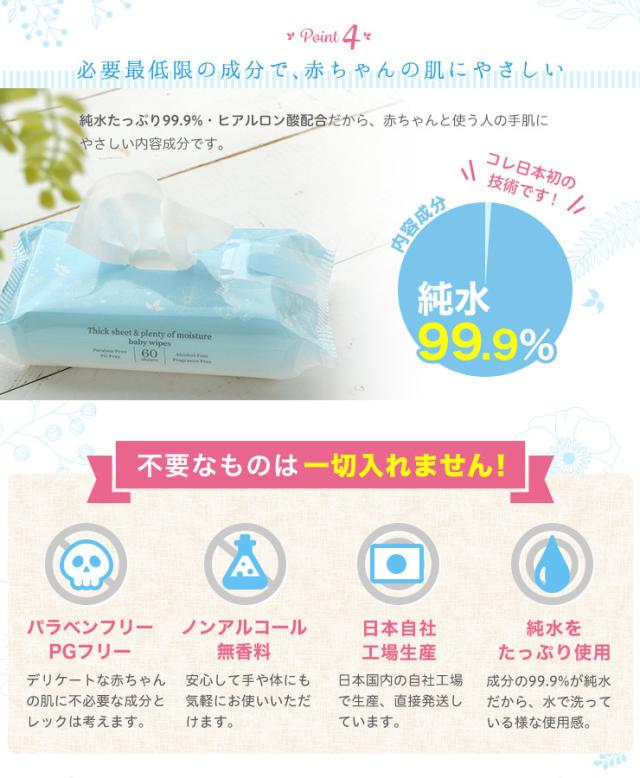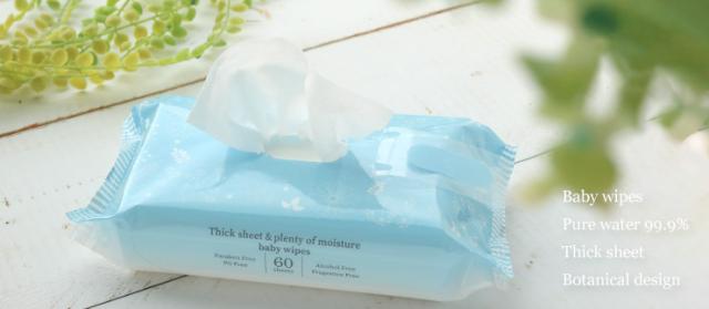 Q.手や口の周りをふいても大丈夫? A.「赤ちゃんのおしりふき」は限りなく水に近い99.9%純水でできています。あかちゃんに影響を与える成分は使用していませんので、安心して使えます。 |