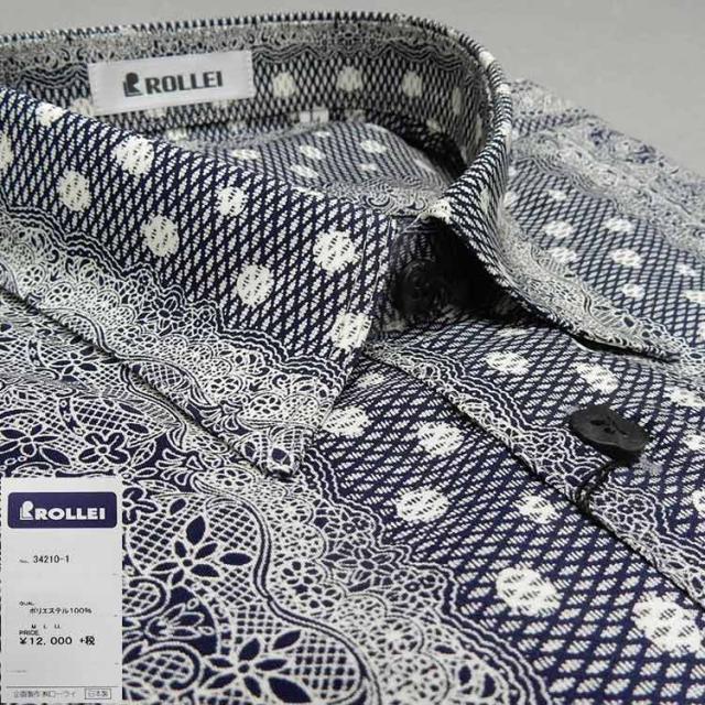 アダルトカジュアルシャツ [ROLLEI] 日本製 長袖 濃紺×白系 レース柄風 デザインシャツ ROL34210-1