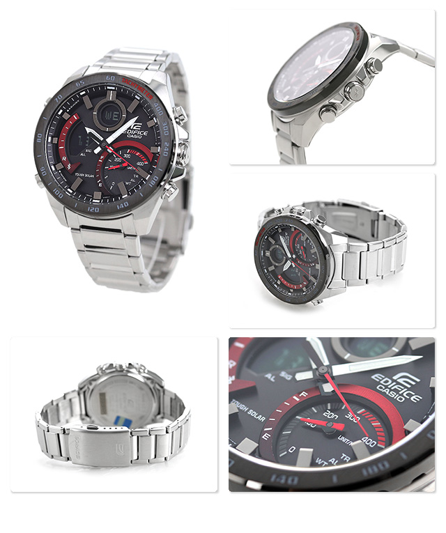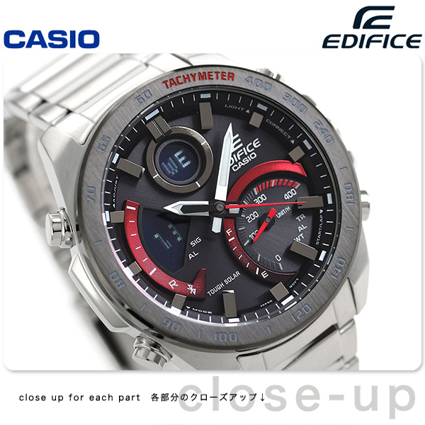 7年保証キャンペーン カシオ エディフィス スマートフォンリンクシリーズ 海外モデル スマートフォンリンク モバイルリンク Bluetooth ソーラー CASIO EDIFICE SMARTPHONE LINK SERIES メンズ 腕時計 ECB-900DB-1ADR アナデジ ブラック×レッド ◆先進の高機能メタルクロノグラフとして進化を続ける「EDIFICE(エディフィス)」から、機能性とデザイン性を併せ持つデジタル・アナログコンビのモデルが登場。ベゼルにタキメーターを採用。秒針などに施されたカラーリングや4時側のスピードメーターをイメージした立体インダイアルが特徴。12時と9時側には、デジタル画面を搭載。針での指針に加えて、液晶での各種情報のわかりやすい表示を可能にしています。また、専用アプリケーションと連携することにより、時刻修正などを簡単に行うことができ、海外渡航時などにも時計のワンプッシュ操作で簡単に時刻修正が可能。また、インターネット上で時刻情報を提供するタイムサーバーにアクセスし、精度の高い時刻を取得できます。 日本未発売モデル