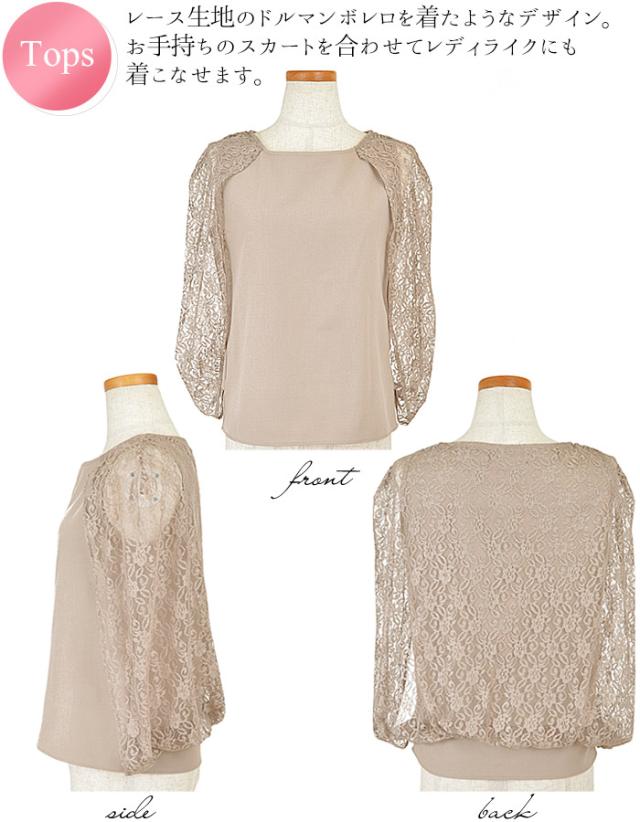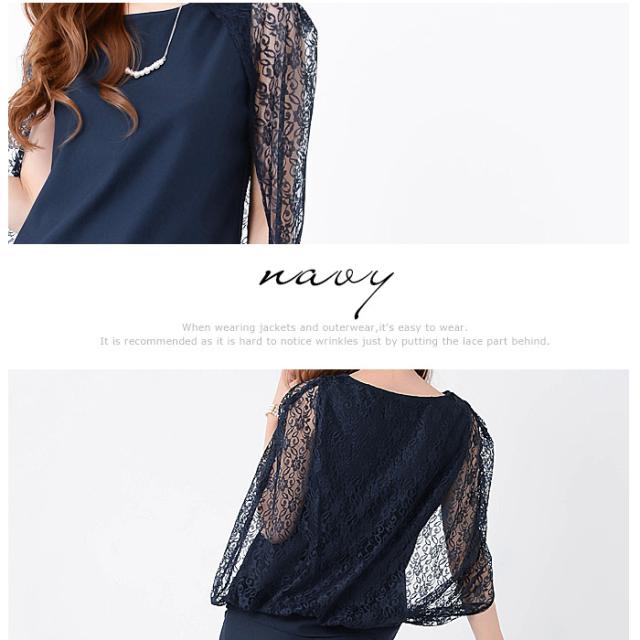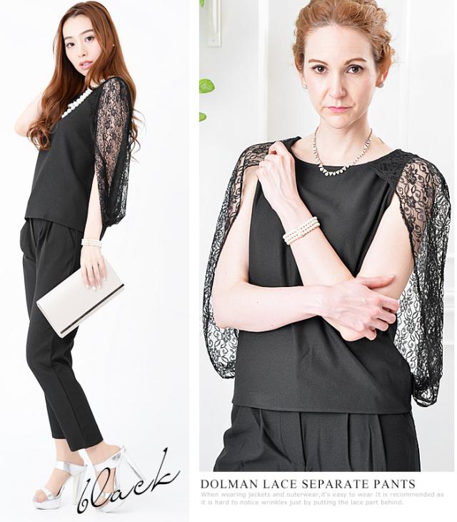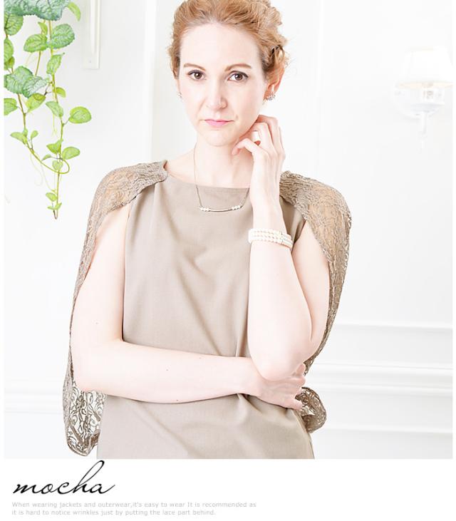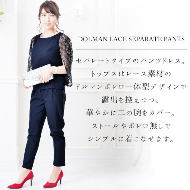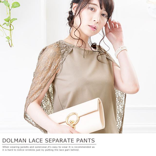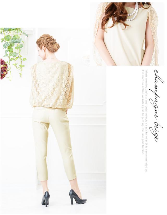 トップスはレース素材のドルマンボレロ一体型デザインで露出を控えつつ、華やかに二の腕をカバー。