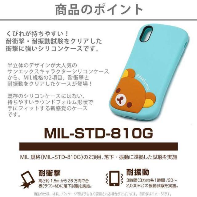iPhone XS/Xに対応。サンエックスキャラクターデザインのiPhone XS/X用シリコンケースです。キャラクター部分はぷっくりとした立体仕様。MIL規格(MIL-STD-810G)の2項目、落下、振動に準拠した試験をクリアした、耐衝撃&耐振動設計。滑らかな手触りで、くびれが持ちやすいラウンドフォルム。画面のお手入れに便利なクリーニングクロス付き。