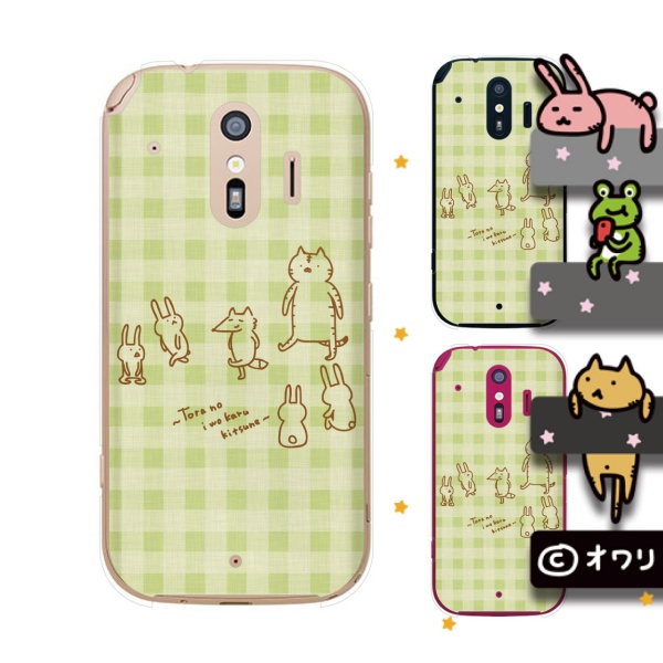 docomo らくらくスマートフォン me F-01L スマホ ケース カバー オワリ 「トラの威を借るキツネ」 グリーン
