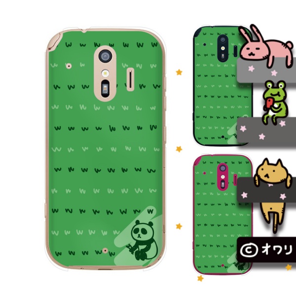docomo らくらくスマートフォン me F-01L スマホ ケース カバー オワリ 「w草むしりするパンダw」 グリーン