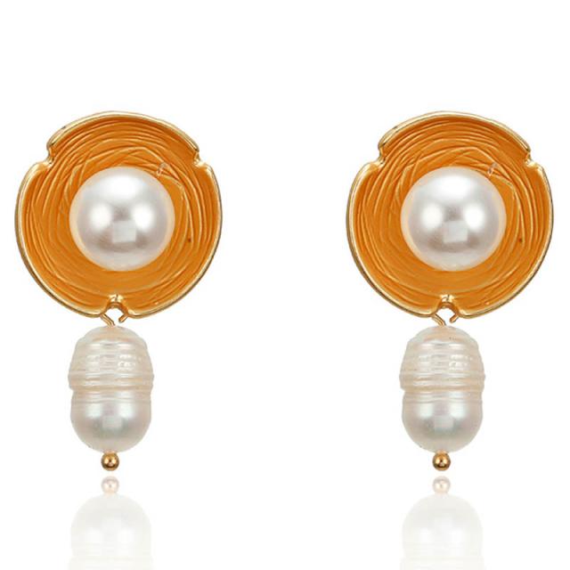 ゴールドメッキした艶消しお椀のようなデザインに真珠を浮かべイミテーションパールが揺れるエスニックなスタイルのスタッドピアスです。キャッチピアスなので装着も簡単。