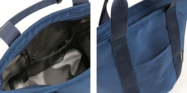 | 内側にはメッシュポケット付き 内側には保冷剤を入れるのに便利なメッシュポケットが付いています。保冷剤を入れることで保冷機能がアップします。 | 外側にもポケット付き カトラリーや携帯電話、鍵などの小物を入れるの便利なポケットが外側に付いています。 |