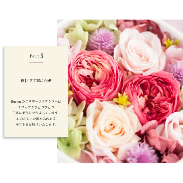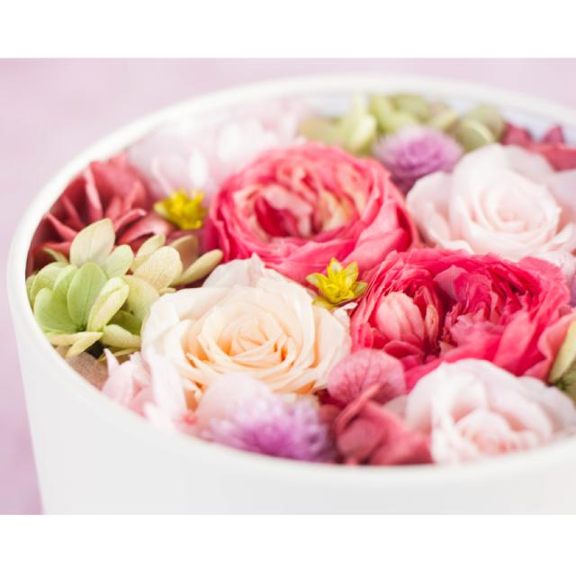 色や形の異なる薔薇を贅沢に使用し、造花やリボン、イミテーションを一切使用せずに全てプリザーブドフラワーでアレンジいたしました。