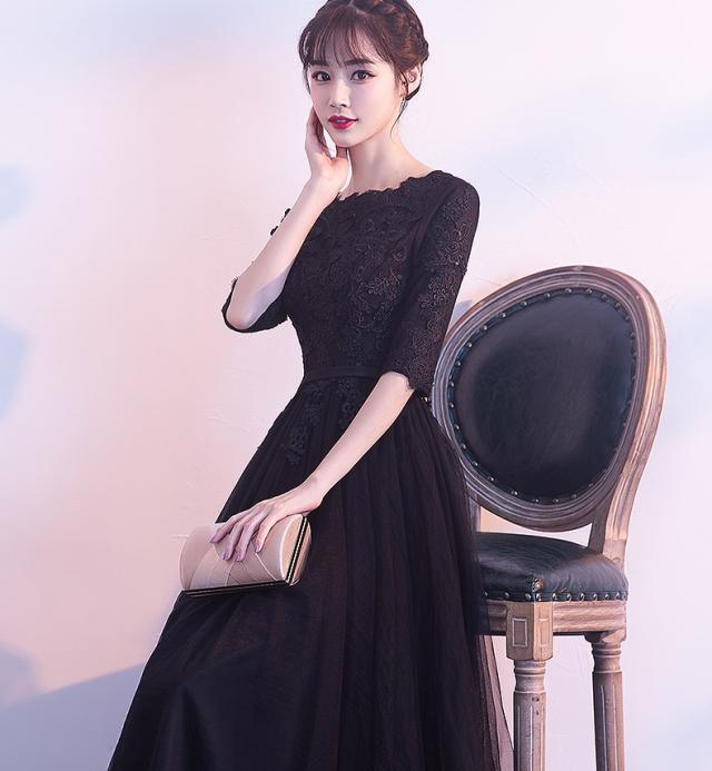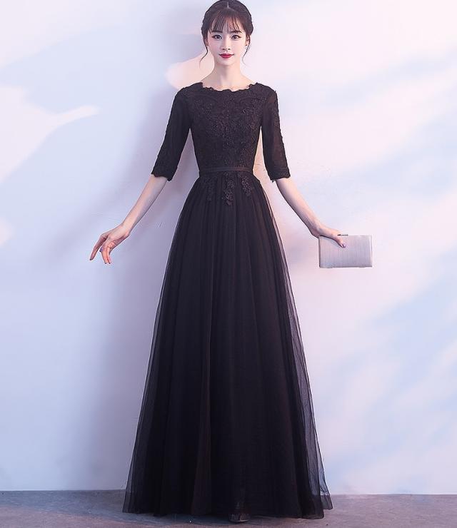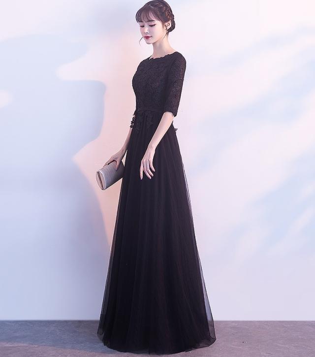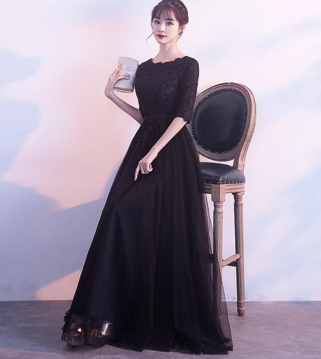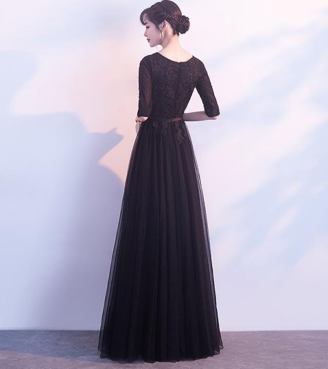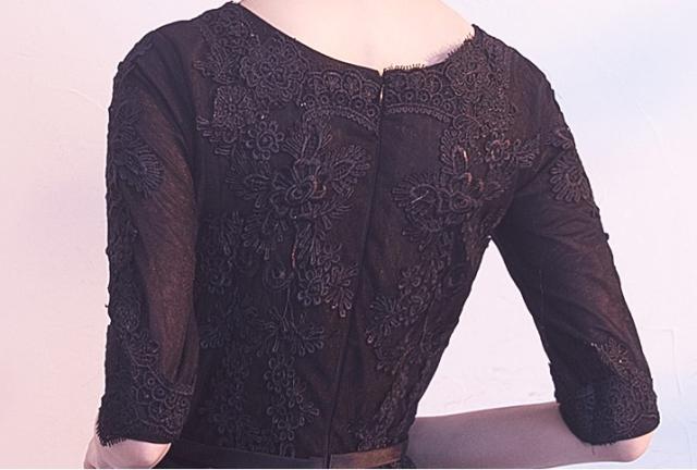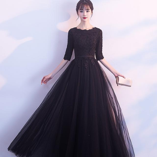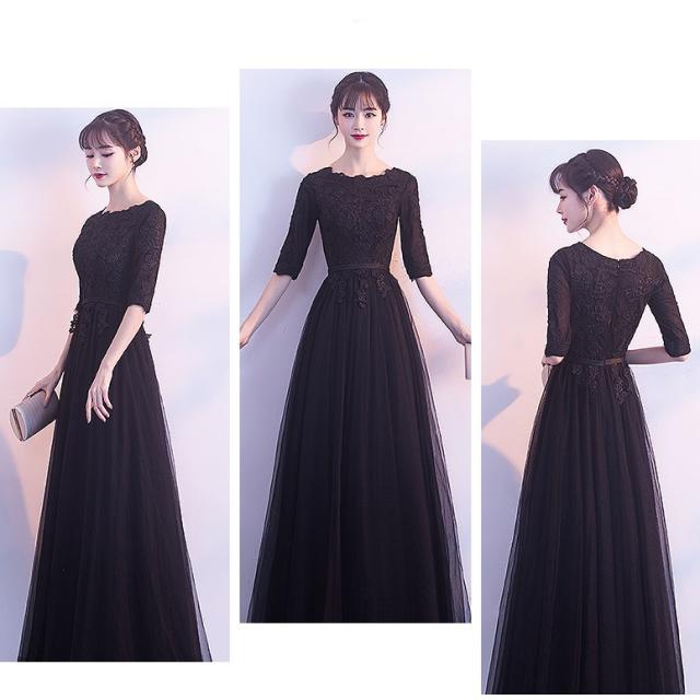 ロングドレス 黒 パーティードレス イブニングドレス ラウンドネック 五分袖 刺繍 レース チュール マキシ丈 Aライン ウエストマーク ブラック 20代 30代 40代 パーティー 結婚式 お呼ばれ 花嫁 披露宴 フォーマル 二次会 発表会 演奏会 女子会 エレガント レディース