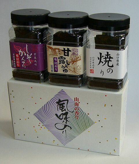 | 原材料 | 甘露しょうゆ海苔:乾し海苔(日本産)、砂糖、食塩、デキストリン、醤油、魚介エキス(昆布、えび、鰹節) 調味料(アミノ酸等)、甘味料(甘草、ステビア)、 (原材料の一部に小麦を含む) しそかんろ:乾し海苔(日本産)、砂糖、食塩、魚介エキス(えび、昆布、鰹節)、醤油、デキストリン、 酵母エキス、しそパウダー、調味料(アミノ酸等)、香料、酸味料、、 甘味料(甘草、ステビア)、香辛料抽出物、 (原材料の一部に小麦を含む) ) 山口産焼のり:乾し海苔(日本産)、 | |