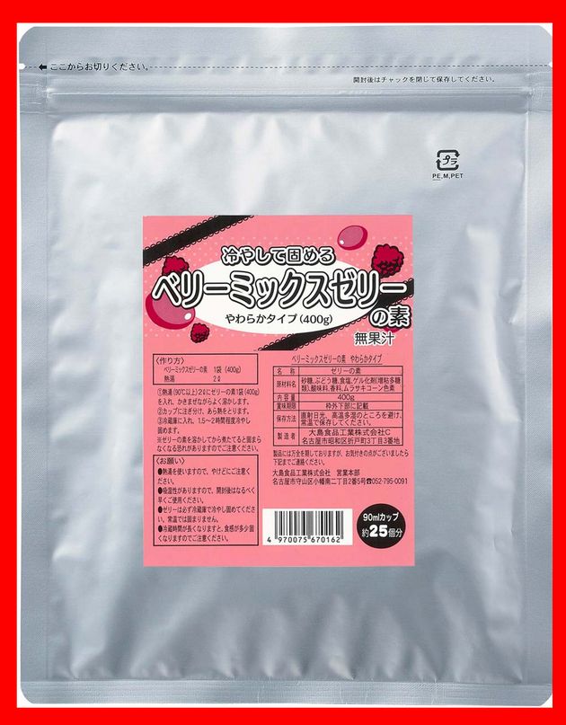 | 原材料 | 砂糖、ぶどう糖、食塩、ゲル化剤(増粘多糖類)、酸味料、香料、ムラサキコーン色素 |
