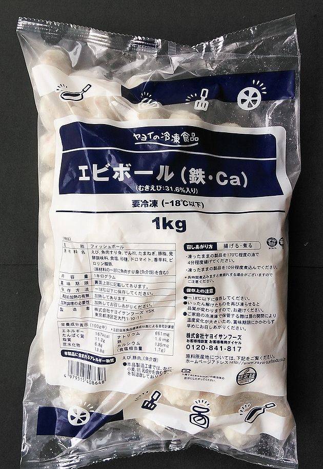 | 原材料 | むきえび(ベトナム)、魚肉すり身(魚介類)、でん粉、たまねぎ、豚脂、発酵調味料、食塩、砂糖、香辛料/ドロマイト、ピロリン酸鉄、 (一部にえび・豚肉・魚肉すり身(魚介類)を含む) |