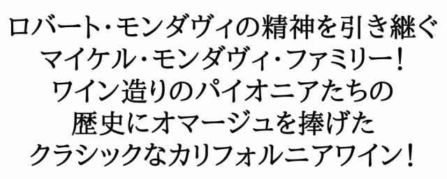 ![]() マイケル・モンダヴィ氏は、妻のイザベルと息子のロブ、そして娘のディーナと共に2004年、「マイケル・モンダヴィ・ファミリー・エステート」を設立しました。4世代の情熱と経験を融合させたワイナリーとワインの誕生です。始まりは1919年、マイケル氏の祖父、セザールが禁酒法が施行されている間、合法的に家庭用ワインを作るためにブドウの選考と醸造必需品を揃える役を担ったことに始まります。それにより、カリフォルニアのロディにてモンダヴィ・ファミリーのワイン作りの挑戦が始まったのです。 ![]() 1966年、ロバートは長男マイケルと、ロバート・モンダヴィ・ワイナリーを設立し、カルフォルニアワインを一流のワインとして世界中に認知させるまでに成長させました。マイケルはロバート・モンダヴィ・ワイナリーで8ヴィンテージのワインを作り、その後、セールスとマーケティングの舵を取りました。ロバートとマイケルはアメリカにおいてファイン・ワインを作ることに生涯をかけて献身し、世界的なカリフォルニアワインの特使として知られるようになりました。 ![]() ロバート・モンダヴィ・ワイナリーは1994年に株式を公開し、マイケルは自身のワイナリーをスタートさせる2004年まで、代表取締役、最高経営責任者、取締役会長として役割を果たしました。今日、息子のロブ・モンダヴィと共に醸造の舵を取り、家族全員がマイケル・モンダヴィ・エステートの国際的レベルのワインを作り上げています。 |