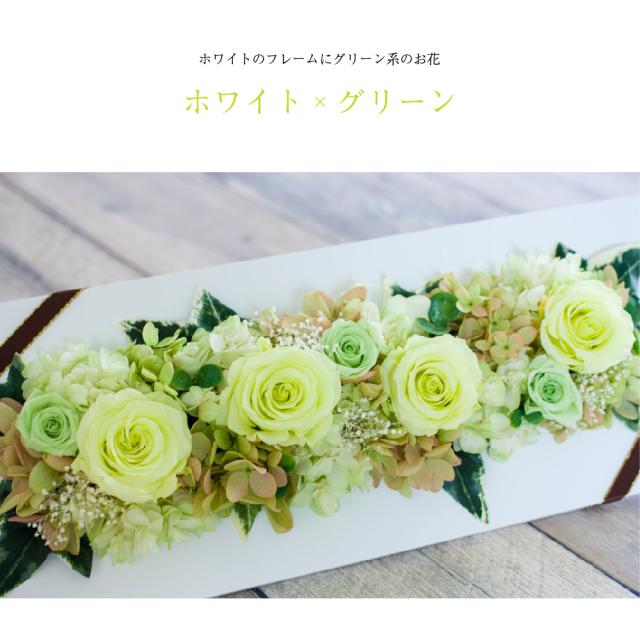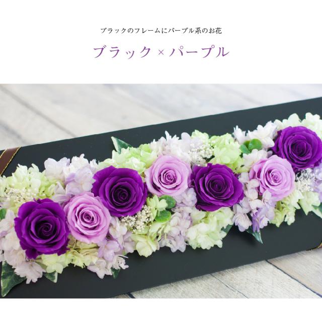 ホワイトのフレームは、ピンク系とグリーン系で可愛らしい仕上がりに、ブラックのフレームはレッド系とパープル系でモダンでカッコ良く仕上げました。※一部造花の葉を使用しています。