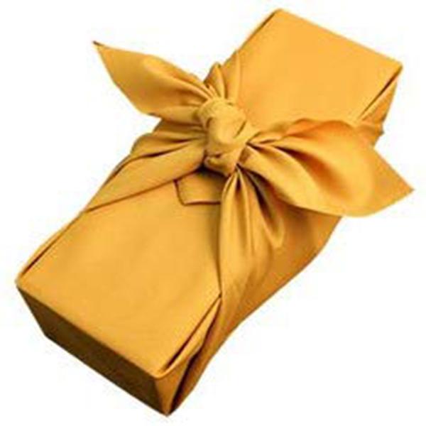 傘寿・長寿のお祝いに。 専用化粧箱に専用熨斗を巻き、その上から黄色の風呂敷で素敵に梱包します。