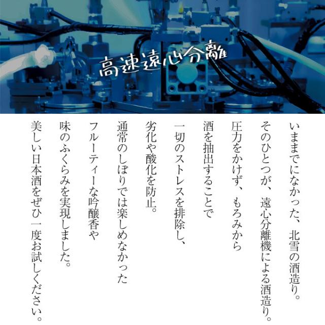 『高速遠心分離』とは、通常のもろみを酒袋(布袋)で搾るという工程ではなく、一切のストレスを排除して劣化や酸化を防止するための現在考えうる最高の搾りです。さらに、遠心分離した清酒を、即時ビン詰めからビン燗処理し、そのまま冷蔵保管しております。