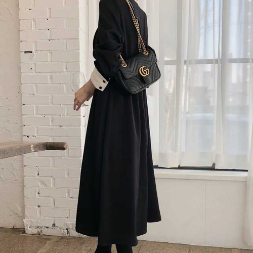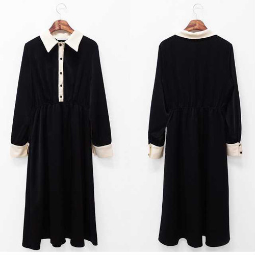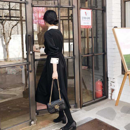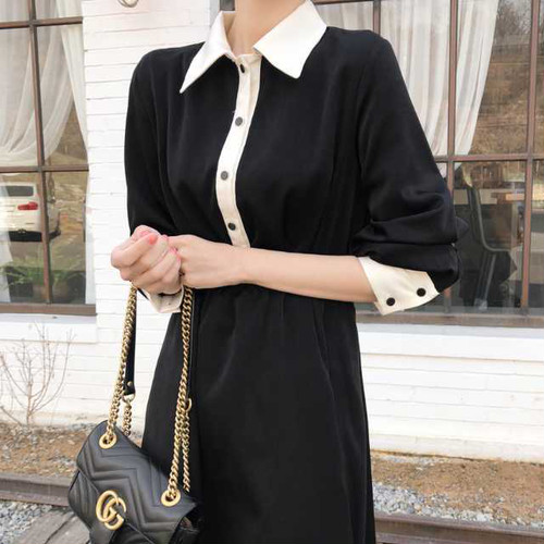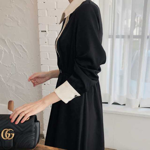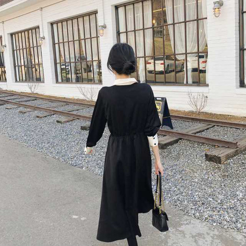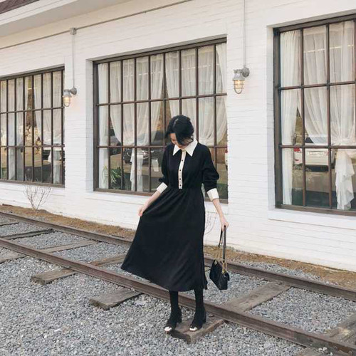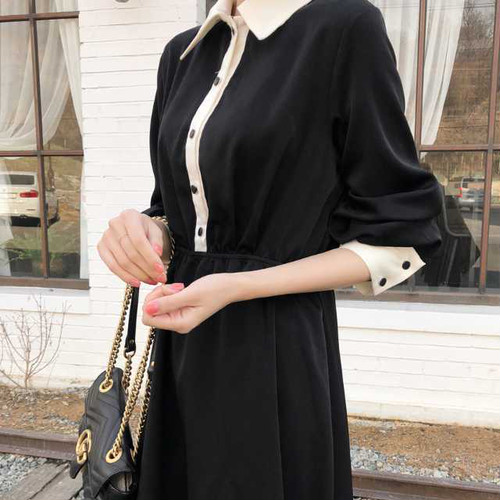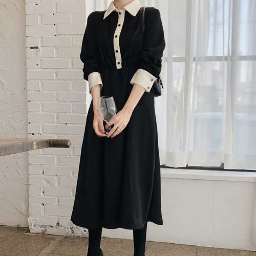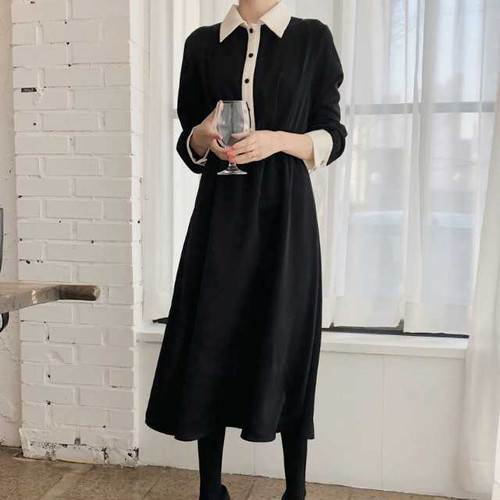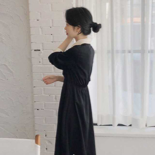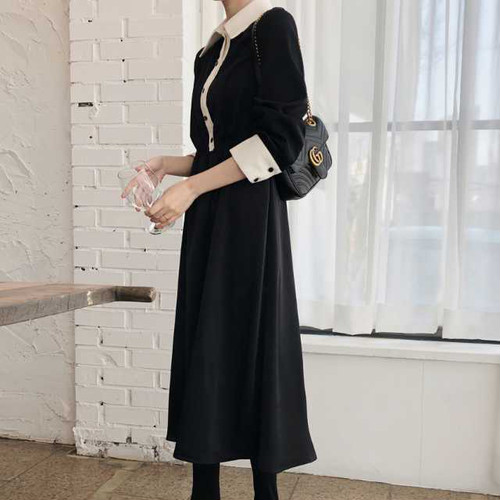 春のワンピース レディース ワンピース 襟付 長袖 ミモレ丈 ハイウエスト 無地 ブラック シンプル きれいめ 大人女子 オルチャン レトロ お呼ばれ 上20 式30 式40 カジュドレ