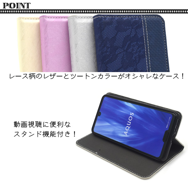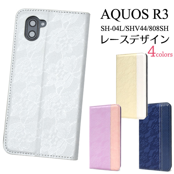 スマートフォンケース AQUOS R3 SH-04L SHV44 808SH用 手帳型 レースデザイン レザーケース 可愛い レース柄 フェミニン お洒落 ベルトなし 横開き スマホカバー 装着簡単 クラシカル