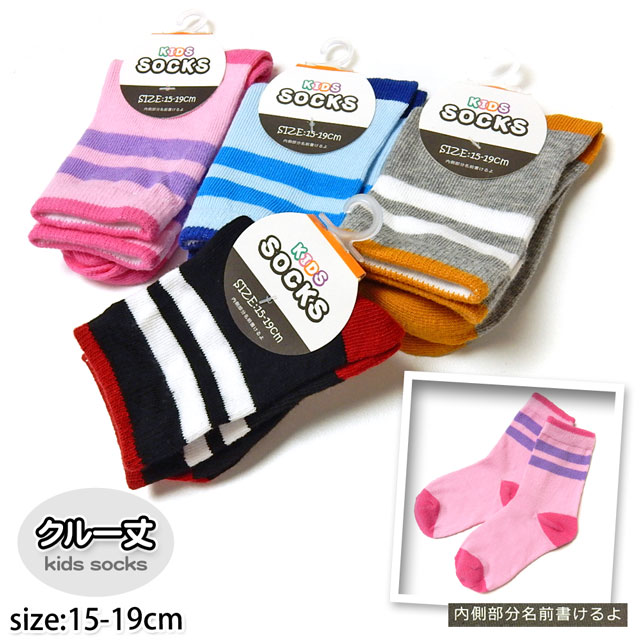 子供 靴下 クルー丈 ソックス 男の子 女の子 綿混 ライン 配色 内側ネームスペース付 男児 女児 キッズ 15-19cm【メール便OK】