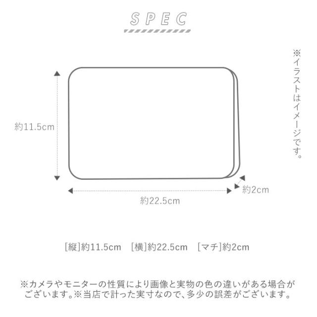 | サイズ | [縦]約11.5cm [横]約22.5cm [マチ]約2cm ※サイズは当店平置き実寸サイズです。実際の商品とは多少の誤差が生じる場合がございます。あらかじめご了承ください。 |