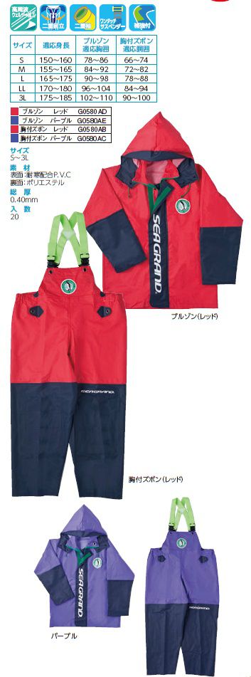 弘進ゴム【KOHSHIN RUBBER】レインウェア/合羽 G0580AB/G0580AC(レッド・パープル) シーグランド SG-01 胸付ズボン【胸付ズボンのみ】 S〜3L