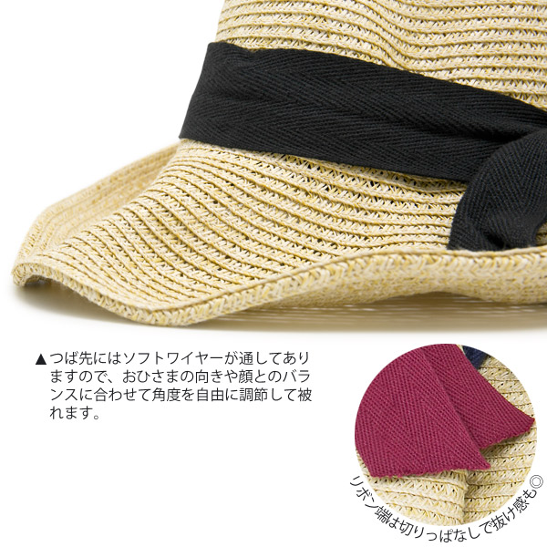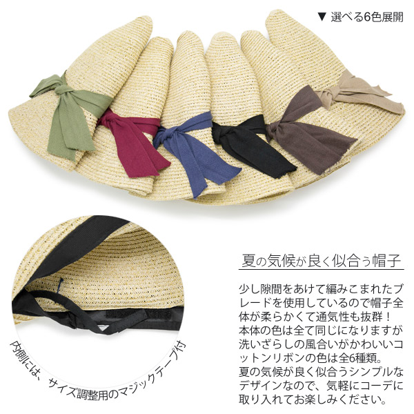 とても柔らかくて簡単に折りたたんで持ち運びができるペーパーハットを入荷しました。少し隙間をあけて編みこまれたブレードを使用しているので帽子全体が柔らかくて通気性も抜群です。つば先にはソフトワイヤーが通してありますので、おひさまの向きや顔とのバランスに合わせて角度を自由に調節して被れます。本体の色は全て同じになりますが、リボンの色は6種類ご用意しております。夏の気候が良く似合うシンプルなデザインなので、気軽にコーデに取り入れてお楽しみください。また、内側のスベリ部分にはサイズ調整用のマジックテープが付いているので若干のサイズ調整が可能です。