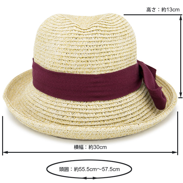 | サイズ | サイズ表記57.5cm(頭囲:約55.5〜57.5cm[紐でサイズ調整可能]、高さ:約13cm、横幅:約30cm[つばも含む]、つばの長さ:約9cm) |