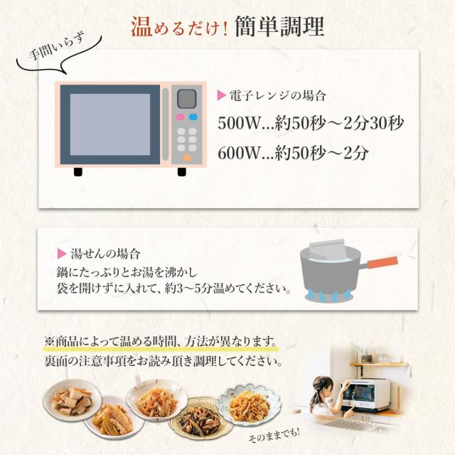 レンジ 湯煎 で 温めるだけ なので 簡単調理 で レンジ対応 パウチ もあります。ご飯のお供 や おつまみ お弁当 の おかず にもおすすめ。