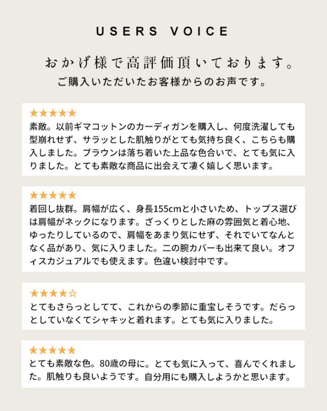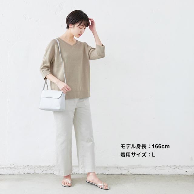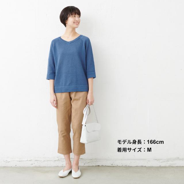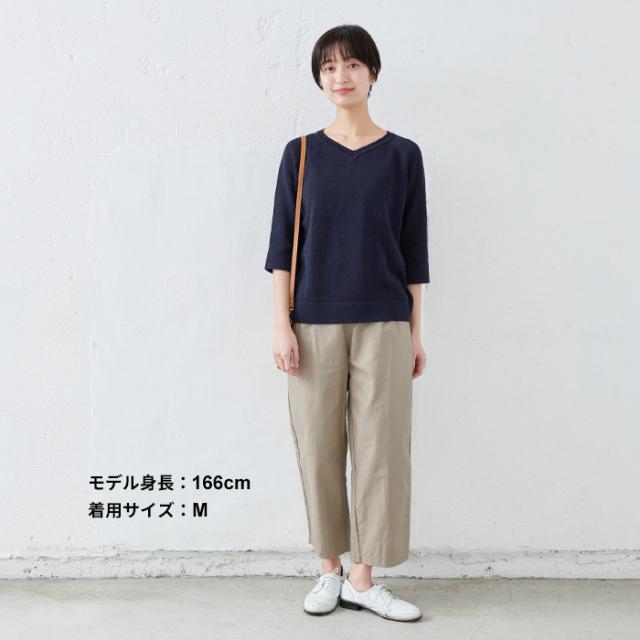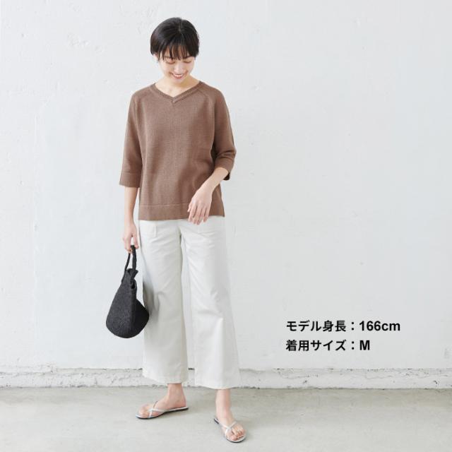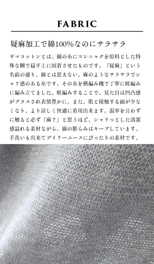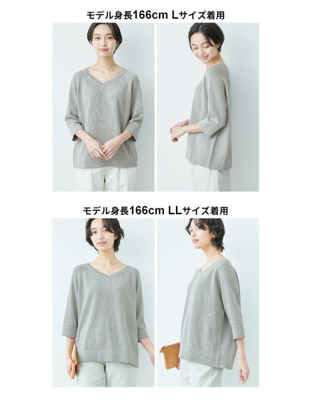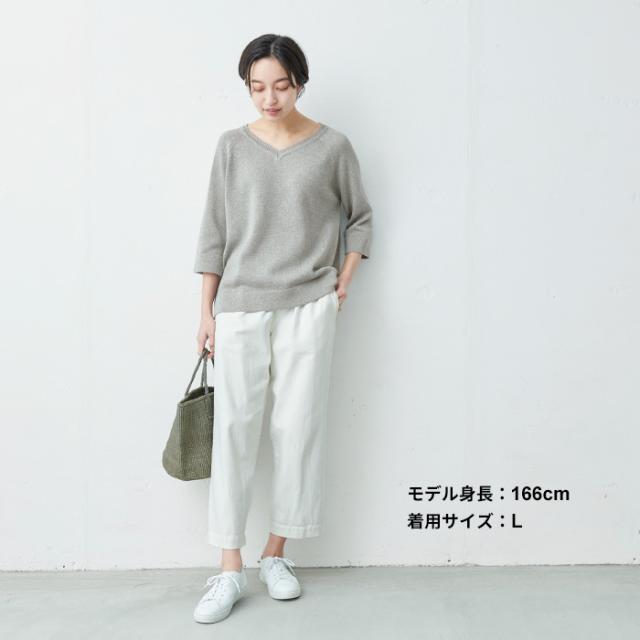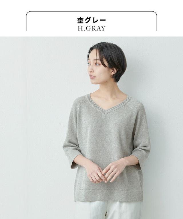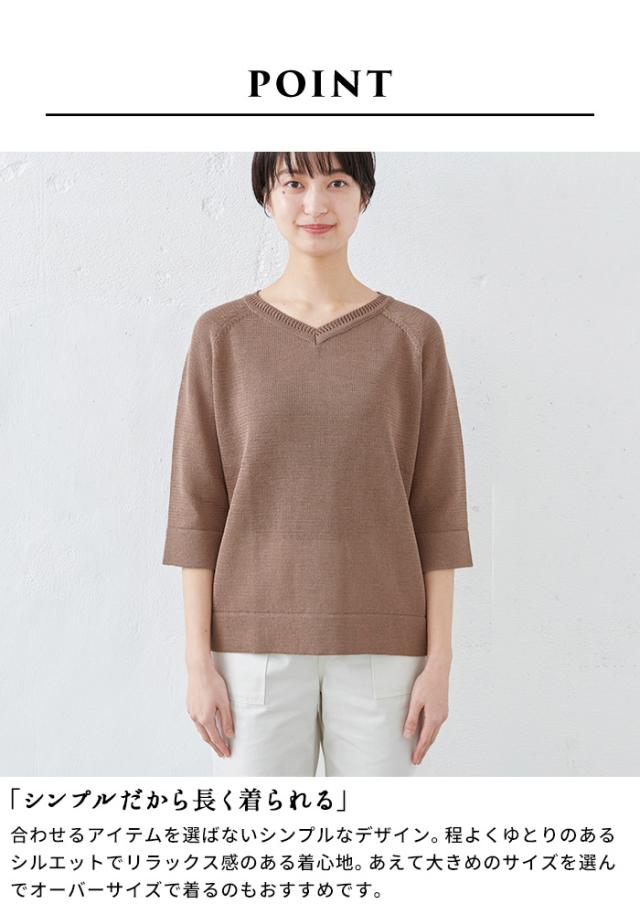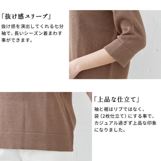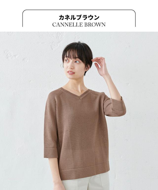 特徴 サラサラで春・夏・秋と着回せるギマニット。シンプルなデザインだから合わすアイテムを選ばず、長いシーズン着回せる。Vネックでシャープに。程よい開きだから、一枚で着られる。ラグラン袖で着心地楽ちん。ニットならではの減らし目が上品な印象。抜け感を出してくれる七分袖で長いシーズン着回すことができます。袖と裾はリブではなく、袋(2枚仕立て)にする事でカジュアル過ぎず、上品な印象になりました。