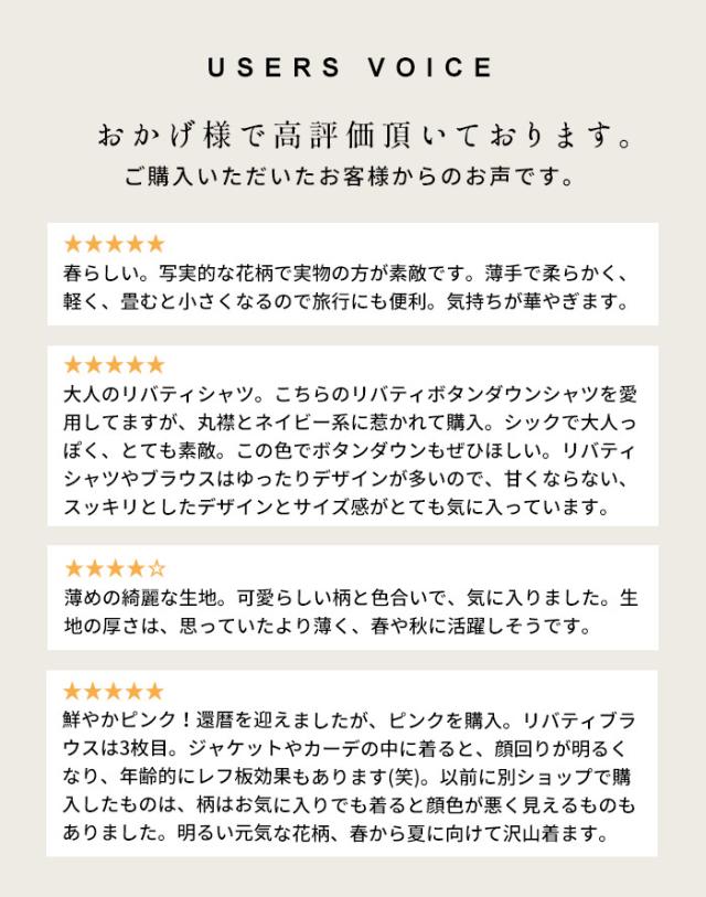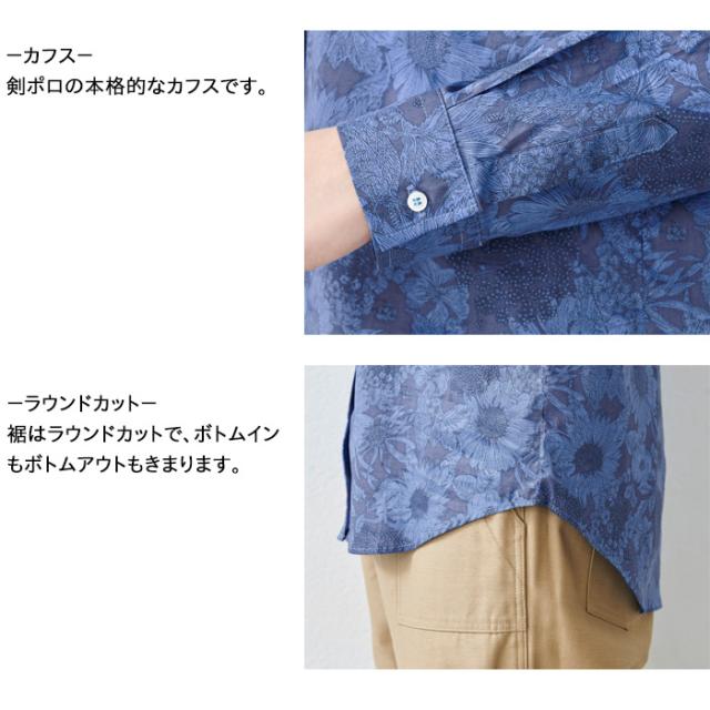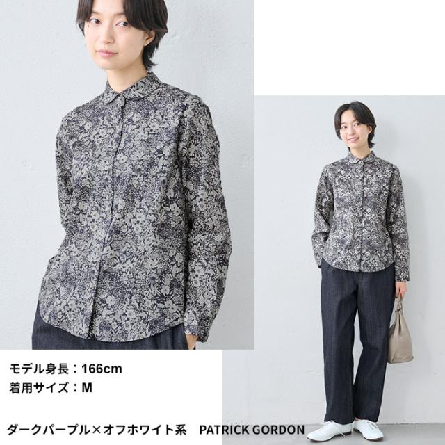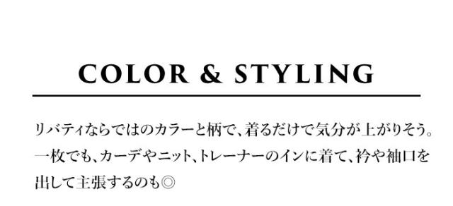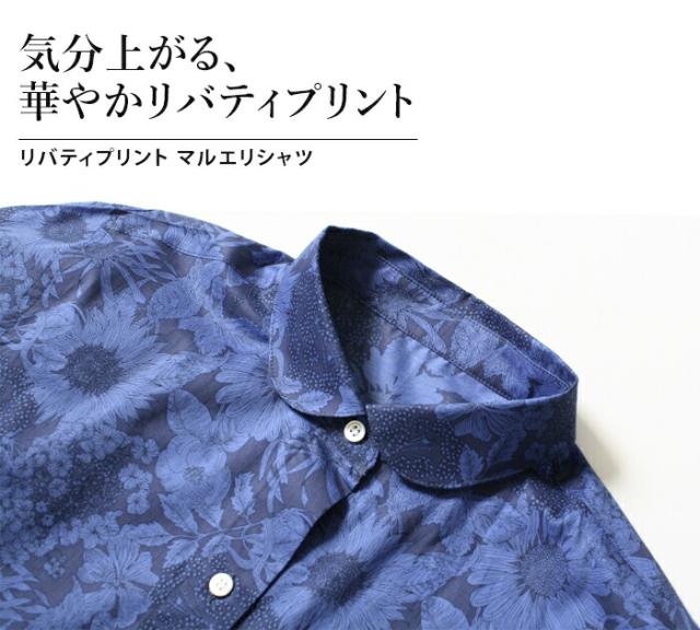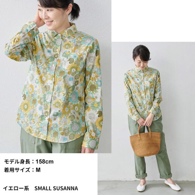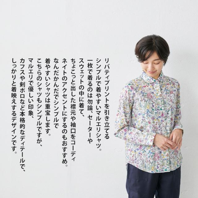 特徴 リバティプリントを引き立てるシンプルで着やすいマルエリシャツ。一枚で着るのは勿論、セーターやスウェットの中に着て、ちょこっと出した襟元や袖口をコーディネイトのアクセントにするのもおすすめ。シンプルで着やすいシャツは重宝します。
