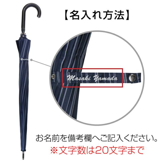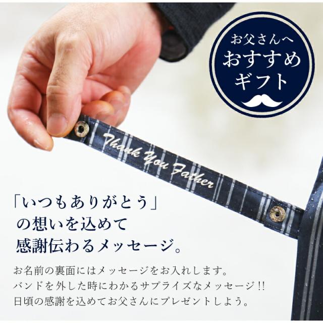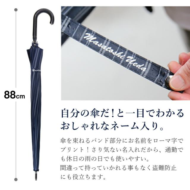 傘を束ねるバンド部分にお名前をローマ字で プリント!さり気ない名入れだから、通勤で も休日の雨の日でも使いやすい。