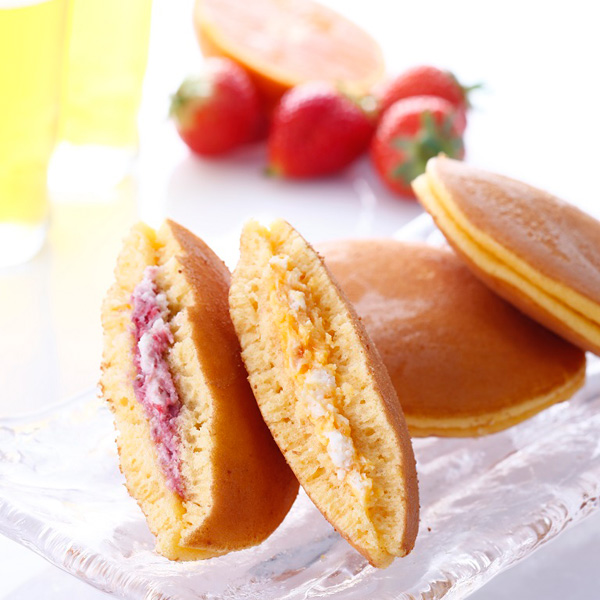いちご生どら:上白糖(国産)、鶏卵、小麦粉、乳等を主要原料とする食品、白あん、水飴、清酒、ストロベリーソース、みりん、グラニュー糖、醤油、いちごピューレ、乾燥いちご / 膨張剤、エタノール、乳化剤、調味料、トレハロース、香料、リン酸Na、ラック色素、カゼインNa、甘味料(ステビア、甘草)、調味料(アミノ酸等)