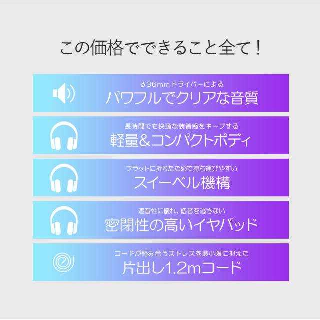 クッション性の良いイヤパッドで耳にぴったりフィットし、遮音性に優れ、低音を逃さないため豊かな高音質が味わえます。