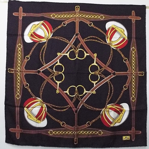 状態★ 光沢があり、さらりとした手触りのシルクスカーフです。ベルトと帽子をモチーフにしたスタイリッシュなデザインです。★【状態】上側に1cm程度の白っぽい汚れがありますが目立ちませんので、まだまだ快適にご使用可能な商品です。★ こちらの商品はネコポス対応で送料無料ですが、ポスト投函となります。配送に3〜7日かかります。★ 宅急便をご希望の場合は、備考欄に「宅急便希望」とお書き添え下さい。また、送料800円が別途掛かりますので、ご了承下さい。