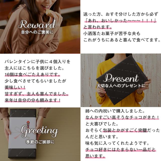 - クッキーとチョコレートのバランスが大変すばらしいです。 香りや味も少しずつ違っていて楽しめました。ですが自分にとっては少々値段が高いのでまた買うには時間がかかりそうです。