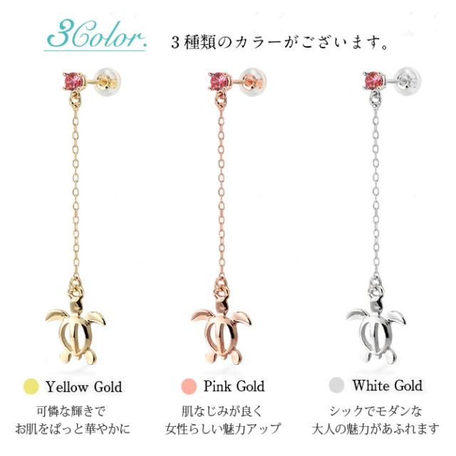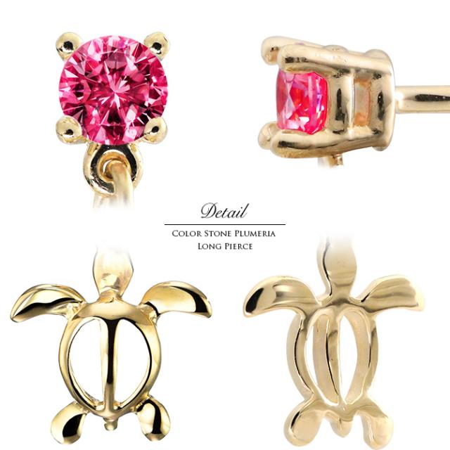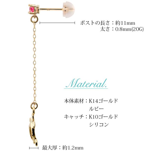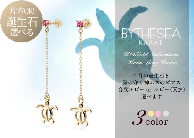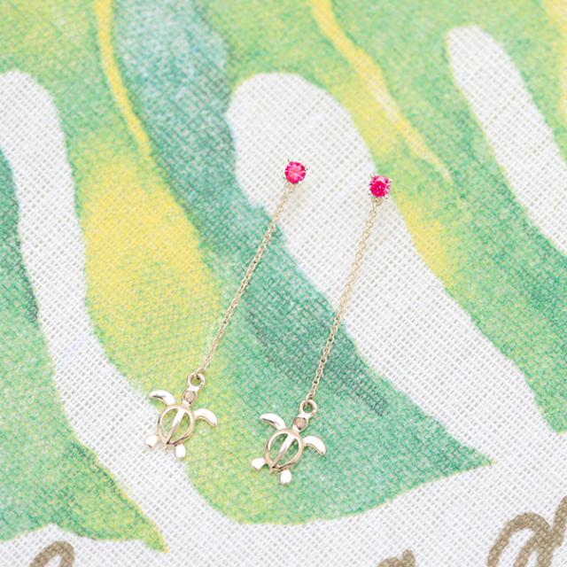 ハワイアンジュエリー ピアス 7月の誕生石 ルビー 幸せ運ぶホヌ チェーン 揺れる カラーストーン 片耳(1個)購入可 K14イエロー ピンク ホワイト 選べる 14K パーツ シリコンキャッチ BY THE SEA バイザシー プレゼント 母の日 【品番:GE502-7】