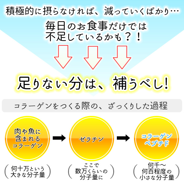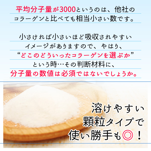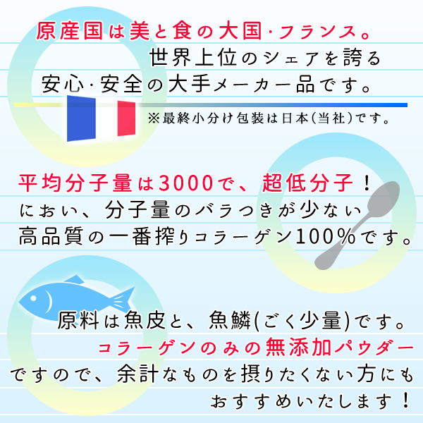 | フランスの世界的大手メーカーで製造された、匂いの少ない上質の低分子コラーゲンペプチド100%です。 通常のコラーゲンですと粒子が大きいため、体内での吸収率が悪く、食品として摂取しても吸収されずに排泄されてしまう可能性が高いので、コラーゲンを摂取されるなら、粒子を小さくし吸収効率を高めたコラーゲンペプチドをお勧め致します。 当商品を測定の結果、平均分子量は3000(かなり小さいうえ分子量のばらつきも少ないもの)で、ロット毎の臭いのばらつきも少ないものですので摂っていただきやすい製品です。 また顆粒タイプですので、お飲み物にも溶けやすく大変便利です。 |